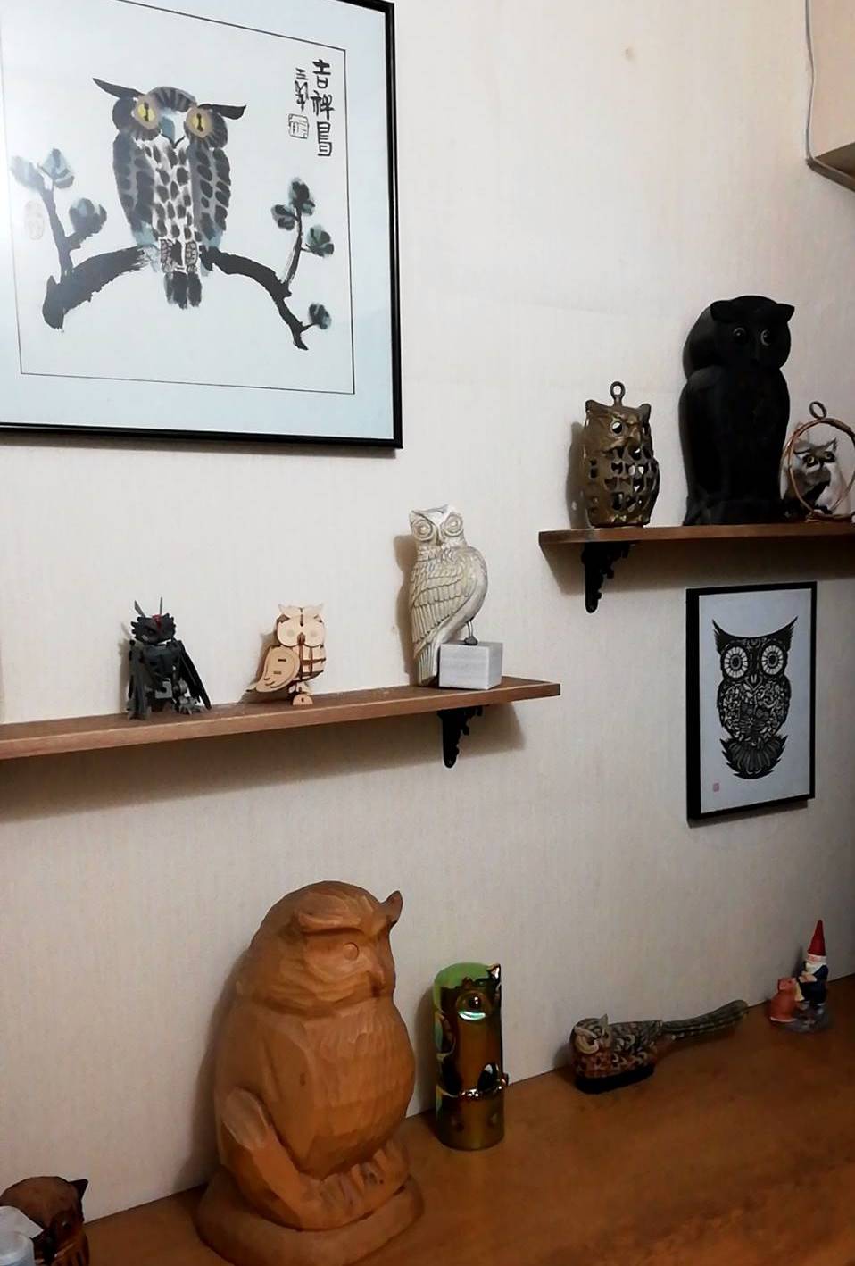 フクロウコーナーを作ってもらいました。 中国、それから日本のものが多いけれど、 ギリシャ、ネパールのものもあります。 日本、アメリカ、中国と引っ越しの間にボロボロになったものもあります。 それから、お引越しの間に紛失したものを思い出ました。