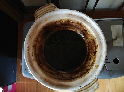 土鍋の内側、黒い部分まで、すった梅を入れたのですが