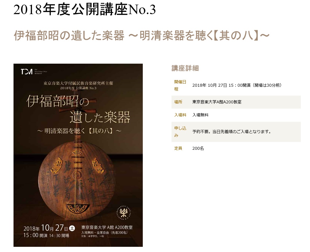 〈講座詳細〉 日程: 2018年 10月 27日 15:00開演(開場は30分前) 場所: 東京音楽大学A館A200教室 入場料: 入場無料 申し込み: 予約不要。当日先着順。 定員 200名 〈明清楽プログラム〉 琴学: 良宵引 (飛田立史氏演奏) 明楽: 陽関曲 五供養 清楽: 九連環 沙窓 月宮殿 十二紅 漫板流水 長崎ぶらぶら節 唐船祭り