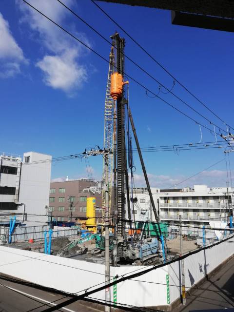 アパートの廊下から杭打機が見えます。