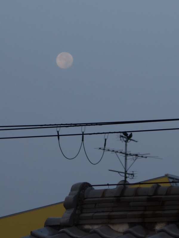 早朝、朝月の満月を眺めていたら、カラスが飛んできました。