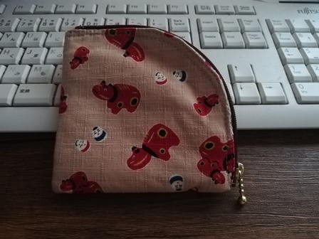 会津の民芸品「あかべこ+起き上がり小法師」生地の手作りの小さなポーチ。