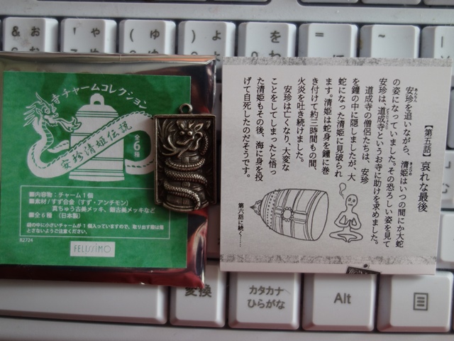 安珍・清姫伝説のチャームです。 中国の白蛇伝由来のなので購入することにしました。 1か月に一つ届くのですが、たのしみです。