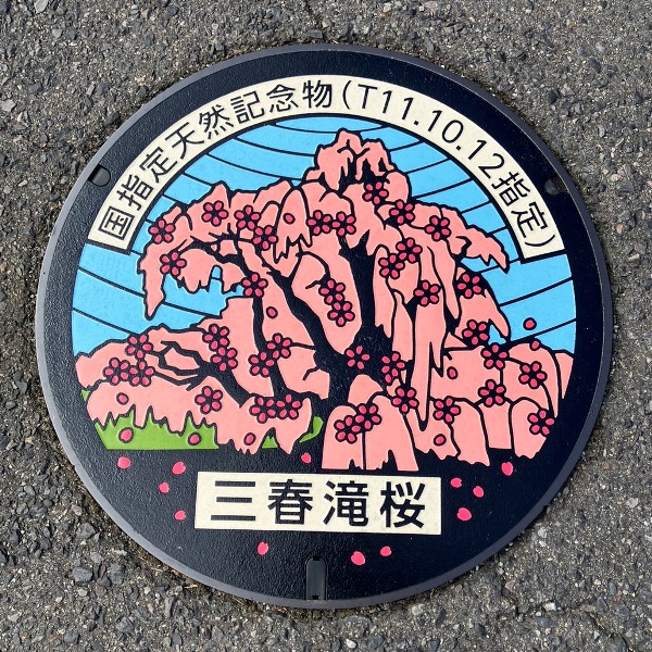 2022年10月福島県三春町(撮影:琴人氏) 勝手に応援している琴人氏から 氏在住の町のマンホールの写真をいただきました。 大正11年10月に国の天然記念物に指定されたのですね。 大正11年=1922年ちょうど100年前です。 私は近隣市町村の出身なのですが、 滝桜の花の季節に見に行ったことがありません。 花のない滝桜は何度か見たことがありますが、 花がなくても圧巻でした。