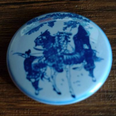 義家(八幡太郎)の武者図が描かれた染付皿の意匠を使ったバッジです。
