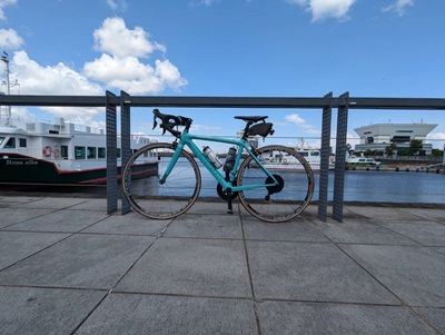 自動車、オートバイとレースをしているコースで自転車のレース。