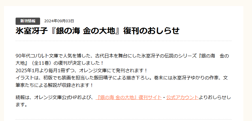 90年代コバルト文庫で人気を博した、氷室冴子の伝説のシリーズ『銀の海 金の大地』(全11巻)復刊が決定!2025年1月より毎月1冊ずつ、オレンジ文庫にて発刊されます。イラストは初版でも装画を担当した飯田晴子による描き下ろし。巻末には氷室冴子ゆかりの作家、文筆家たちによる解説が収録されます! pic.twitter.com/Oc9CKySwtO